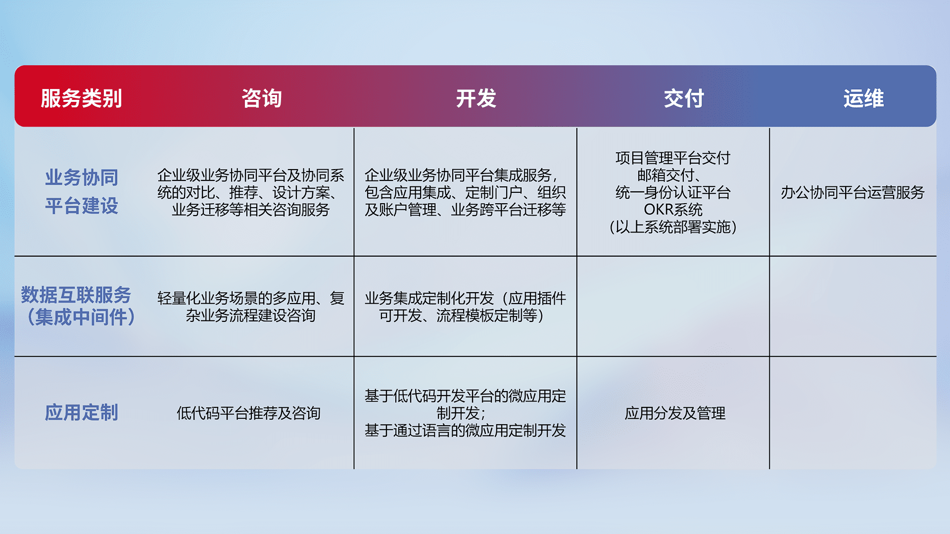 针对钉钉、、企微、、、IDaas等平台级产品提供产品的规划、、、方案、、、、交付、、定制化开发等服务,,,实现如统一协同办公、、、智能客户服务、、、、混合会议管理、、、智能数据查询、、、、等业务场景,,实现数字化转型。。