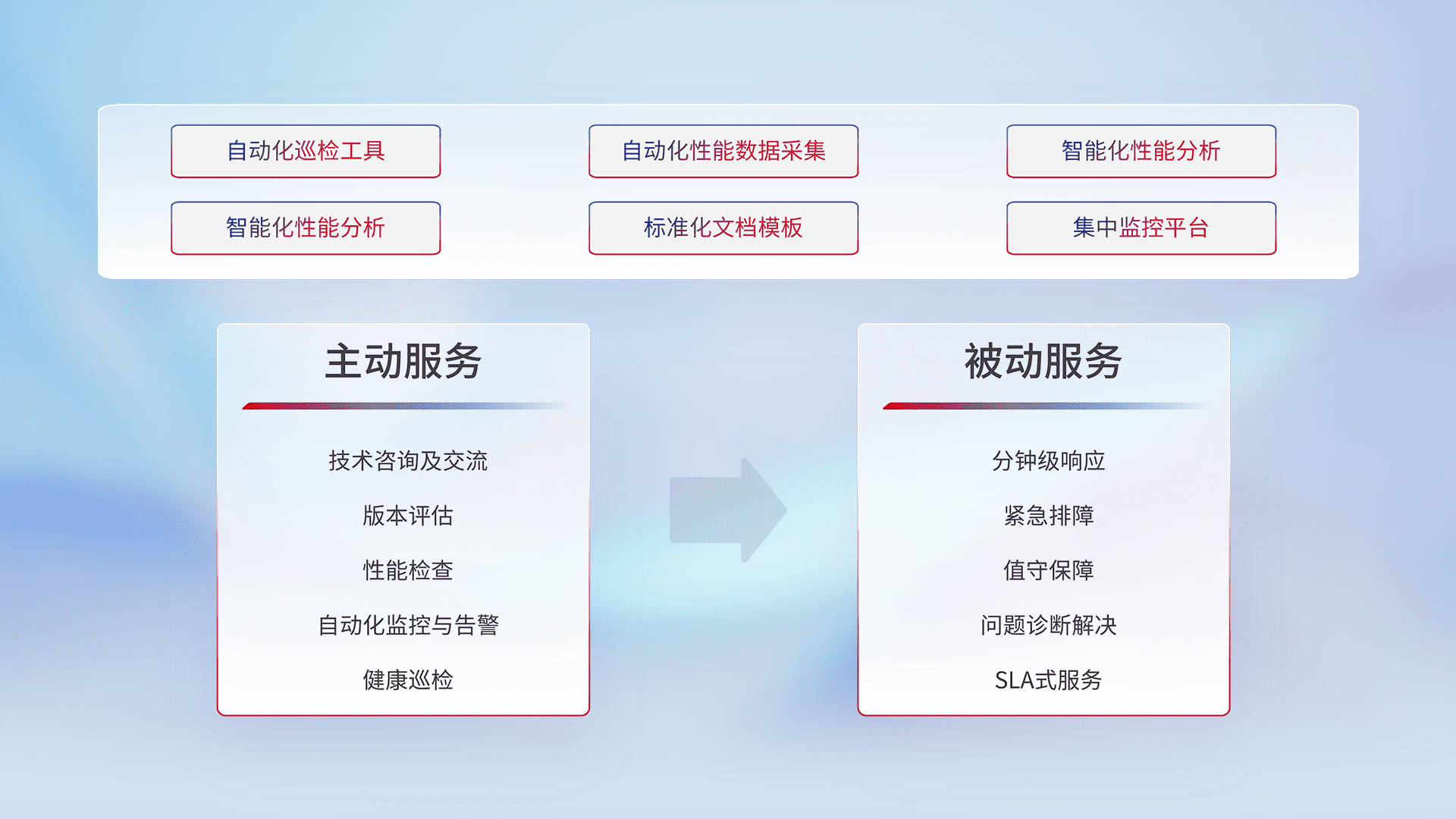 智能化工具和标准化文档,,,,保障服务质量,,,提供主动服务(包含技术咨询、、版本评估、、性能检查、、、、自动化监控与告警、、健康巡检)和被动服务包含(分钟级响应、、、、紧急排障、、、值守保障、、、、问题诊断解决、、、SLA服务)。。。。